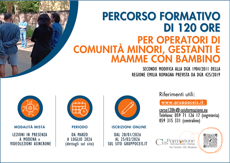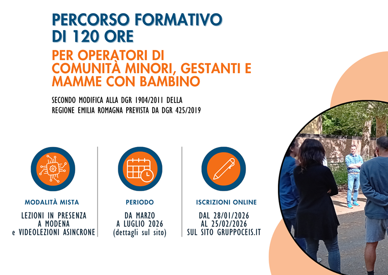 Fino al 25 febbraio è possibile iscriversi al percorso formativo di 120 ore per operatori di comunità minori e mamma-bambino previsto dalla normativa regionale, per coloro che non sono in possesso dei titoli richiesti per il “gruppo A1” (cfr DGR 1904/2011 e DGR 425 del 25/03/2019). Il corso si svolgerà da marzo a giugno 2026.
