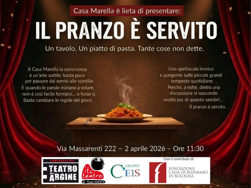 Un evento che unisce cultura, partecipazione e inclusione sociale. Giovedì 2 aprile alle ore 11.30, Casa Marella a Bologna apre le sue porte alla cittadinanza per uno spettacolo teatrale speciale, “Il pranzo è servito”, realizzato dagli ospiti della comunità insieme agli attori professionisti del Teatro dell’Argine.