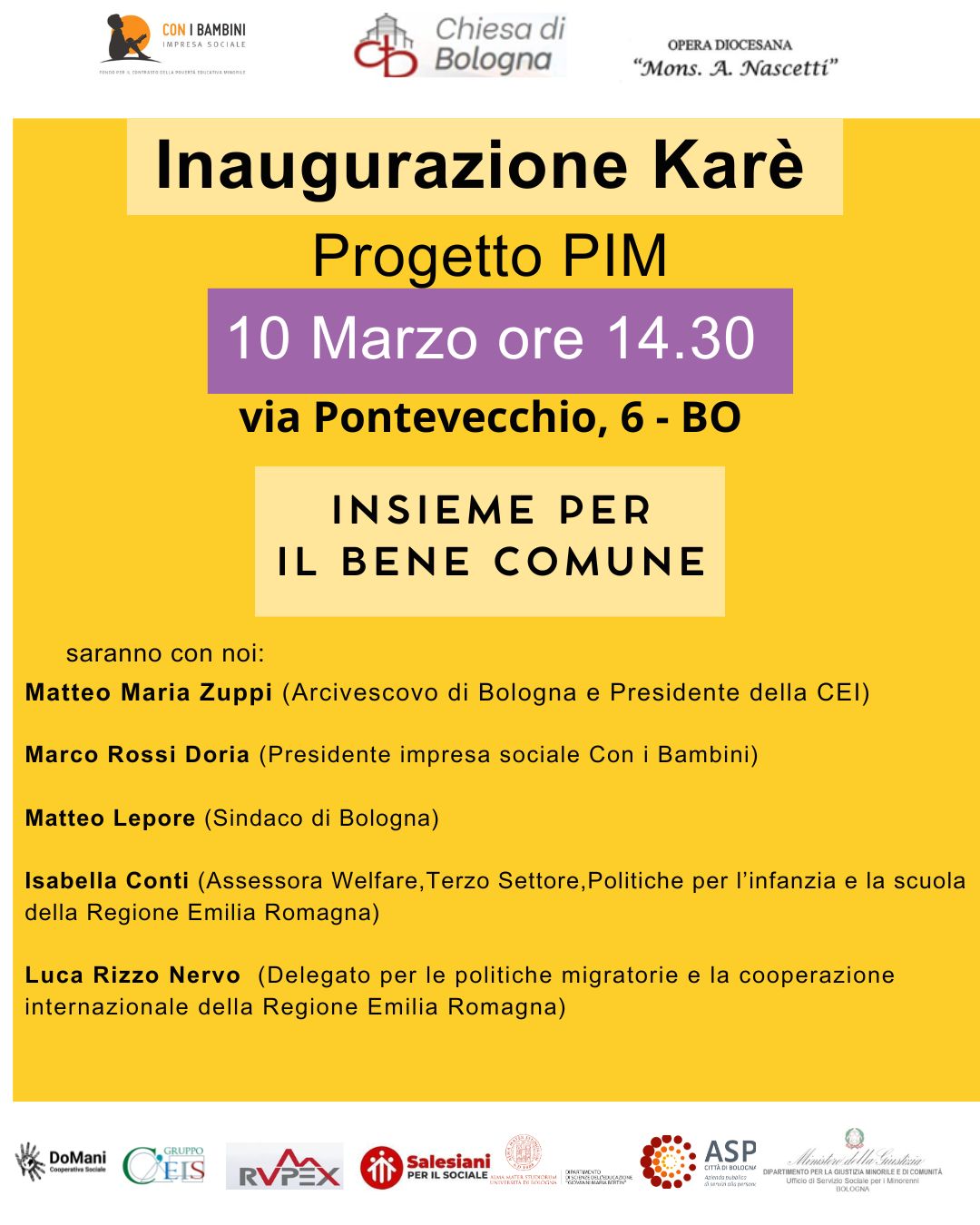 Martedì 10 marzo alle ore 14.30, in via Pontevecchio 6 a Bologna, si inaugura ufficialmente Karé, il nuovo spazio del Progetto PIM dedicato ai minori e neomaggiorenni a rischio di emarginazione, nato all’interno del Centro Polifunzionale San Giuseppe.